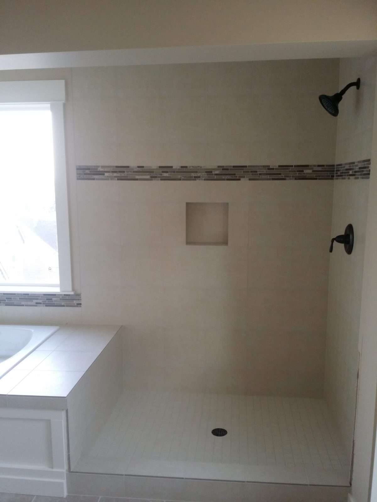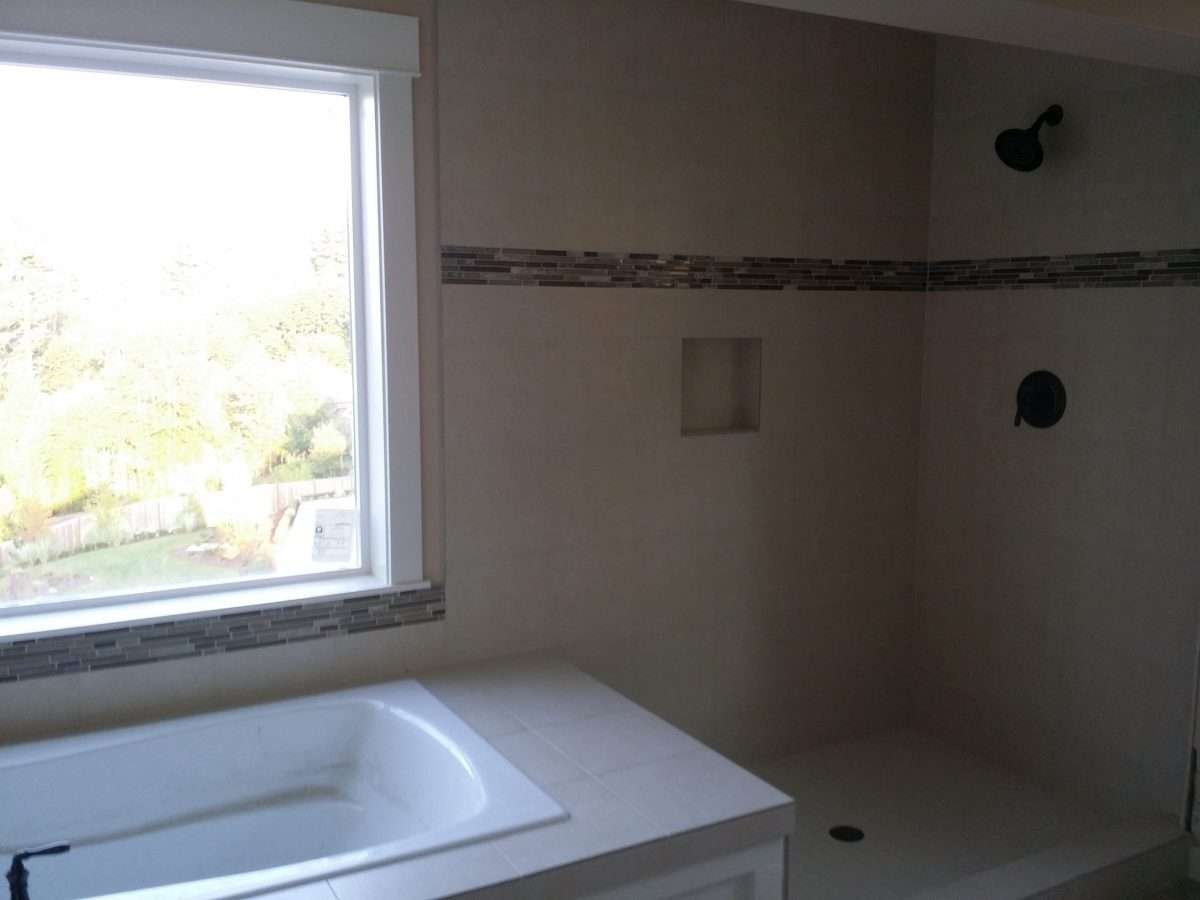 The design features a spacious bathtub surrounded by beautiful, neutral-toned tiles, creating a serene and inviting atmosphere. A subtle mosaic accent line adds a touch of sophistication, while the recessed niches provide practical storage solutions without compromising on style. The carefully chosen fixtures and finishes contribute to a cohesive look, transforming the bathroom into a relaxing spa-like retreat.