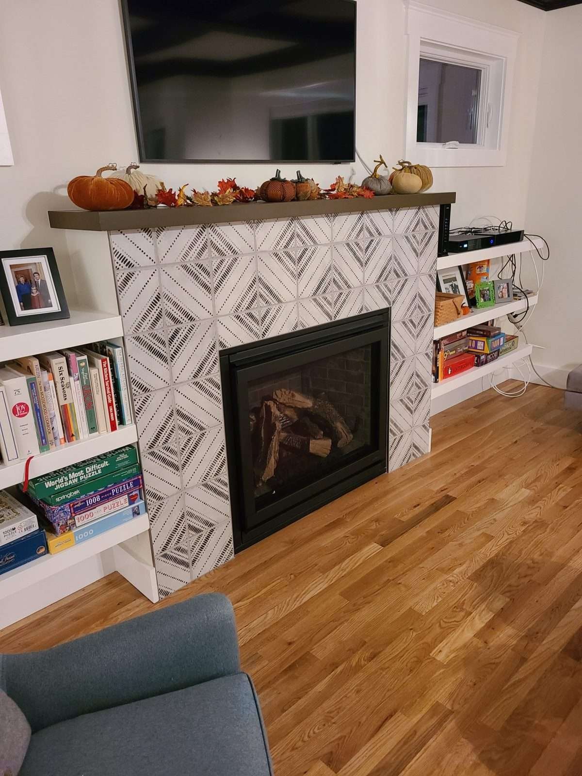 The project features intricate tile work with a geometric pattern that adds texture and visual interest, making the fireplace stand out as a centerpiece. The redesign balances contemporary style with cozy functionality, ensuring that the fireplace remains a warm and inviting spot in the home.