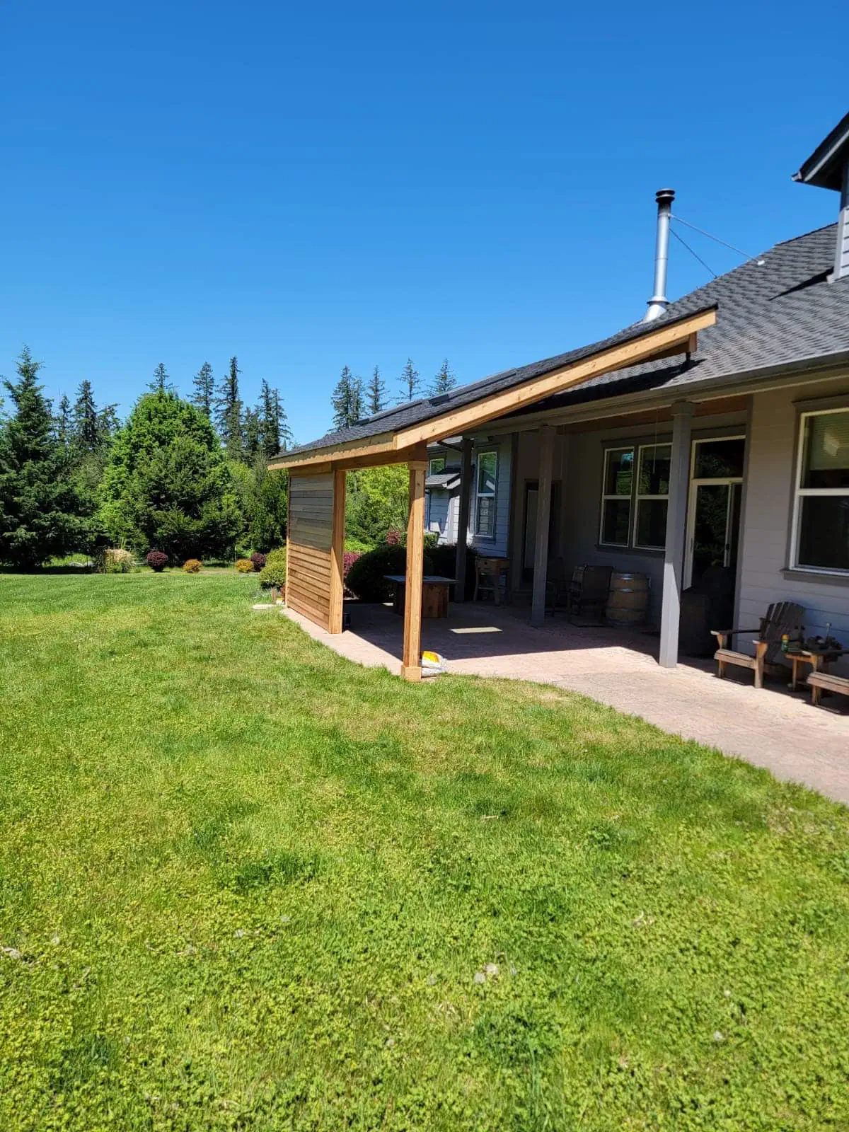 This patio cover construction enhances the home’s outdoor living space, seamlessly blending with the existing structure while adding functionality and style. Designed for both comfort and durability, this extension provides a partially enclosed area that offers shade, weather protection, and year-round usability.