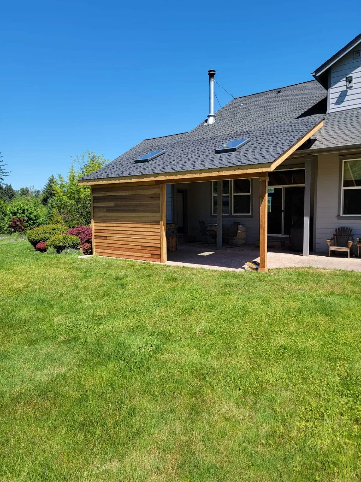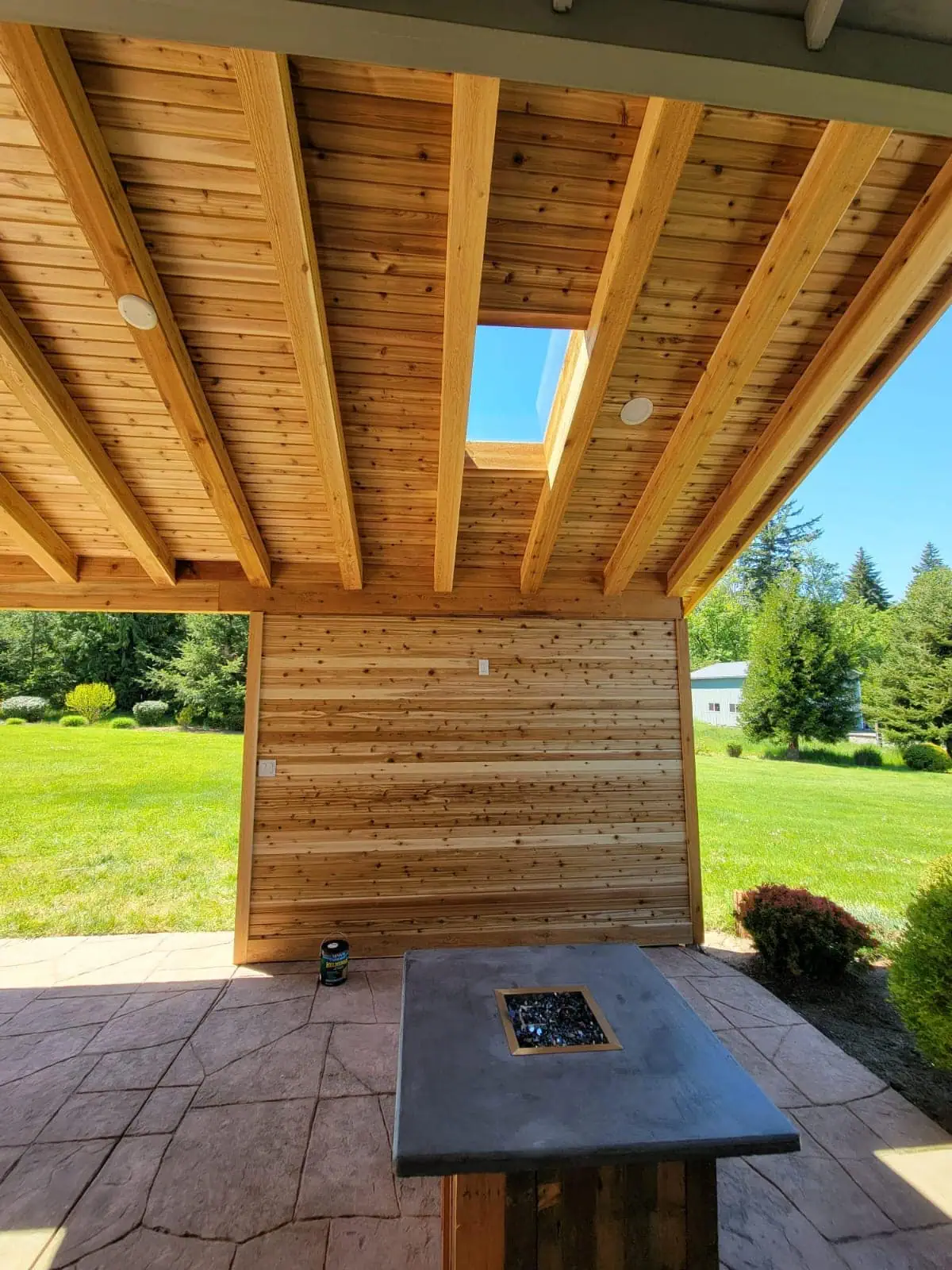 The natural wood framework complements the home’s aesthetic, while the skylights allow for ample natural light, maintaining an open and airy feel. Whether for relaxation or entertaining, this covered patio transforms the backyard into a versatile outdoor retreat.