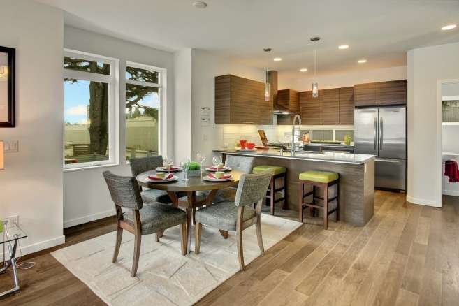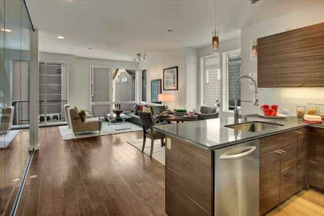 The open layout allows for seamless integration with adjacent living and dining areas, fostering a sense of connectivity and openness. Warm wood tones and subtle accents bring a touch of coziness to the modern aesthetic, making it a perfect space for both cooking and entertaining.