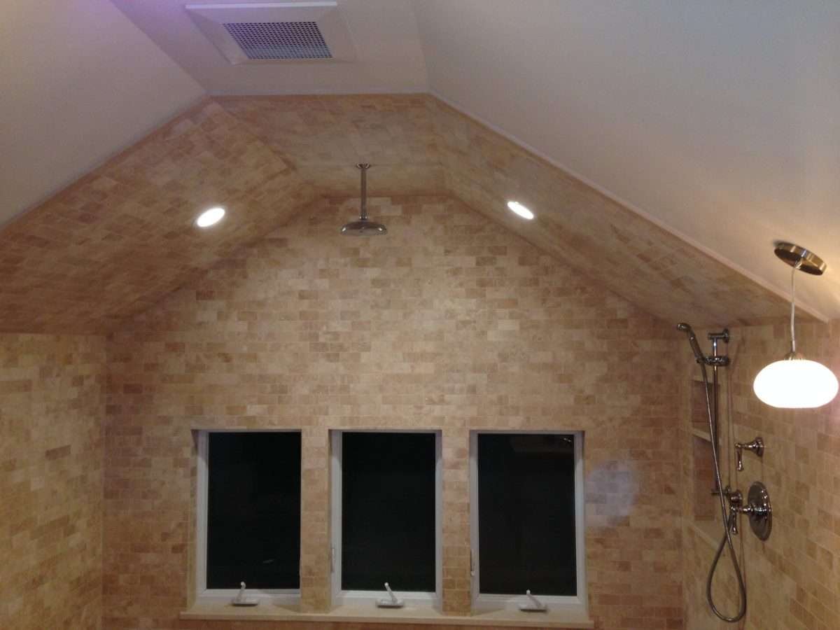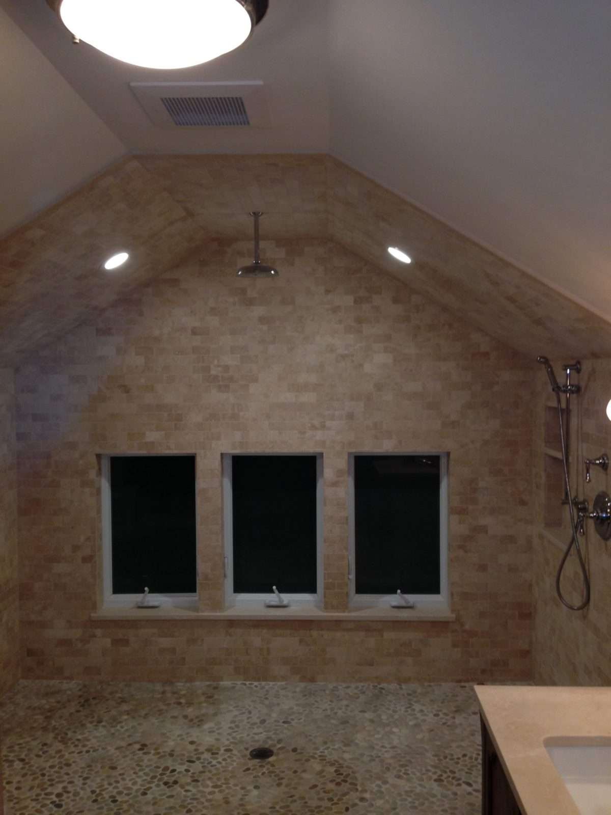 The high, vaulted ceiling and carefully positioned lighting enhance the spacious feel of the room, while the walk-in shower and deep soaking tub offer the perfect blend of style and relaxation. This renovation demonstrates our commitment to combining high-end materials with expert craftsmanship, resulting in a bathroom that is both beautiful and durable.