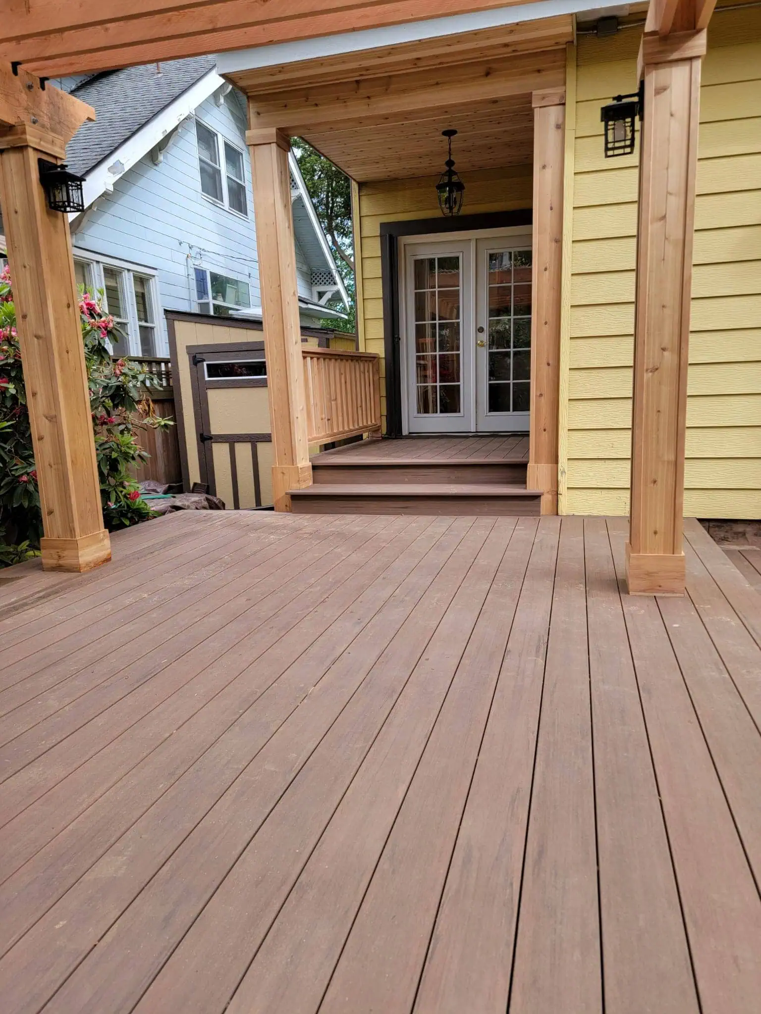 This custom-built Ironwood deck features a covered entryway with a wooden slatted ceiling, integrated lighting, and a seamless connection to the home. Designed to withstand Seattle’s climate, the deck offers both style and durability, perfect for year-round use.